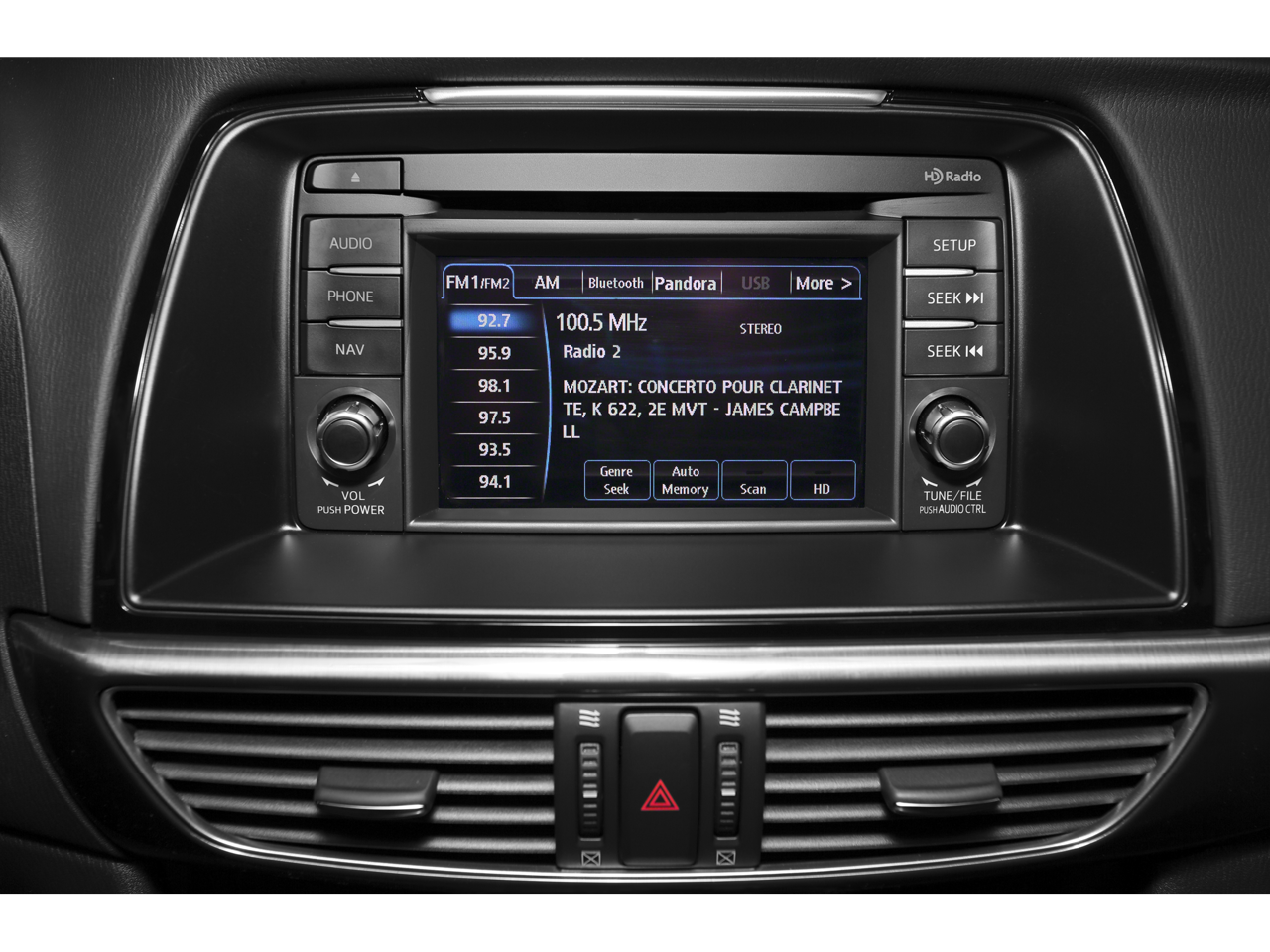 - Radio: AM/FM/CD/MP3/AUX 6-Speaker Audio & HD Radio -inc: 4-full range door speakers and 2-tweeters, audio menu voice-command, Bluetooth® hands free phone and audio, E911 automatic emergency notification, 5.8" full-color touch-screen display for audio, phone, rearview camera, Commander Switch for touch-screen display, Pandora internet radio compatibility, Radio Broadcast Data System program information, SMS text message audio delivery and reply and USB audio input